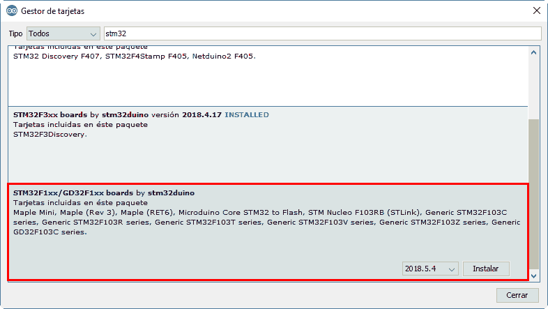 Volvemos al gestor de placas, y tendremos disponibles las placas STM32. Instalamos las que necesitemos. En particular, para la (STM32F103C8T6) vamos a necesitar las STM32F1X.