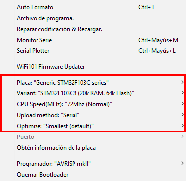 Además en puerto hay que seleccionar el puerto COM generado por el conversor USB-TTL